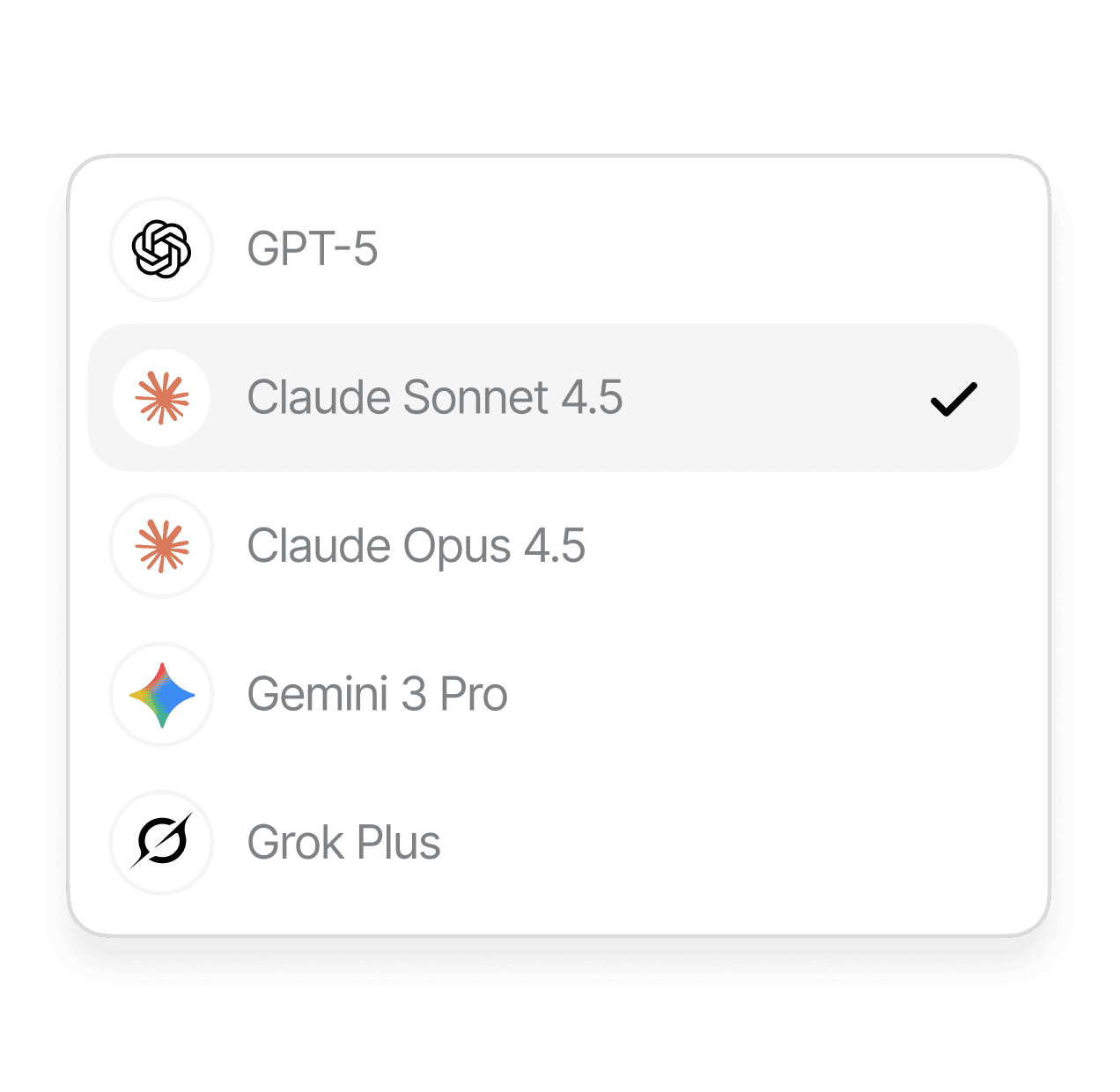 Choose between every cutting-edge model from OpenAI, Claude, Gemini, and Grok.